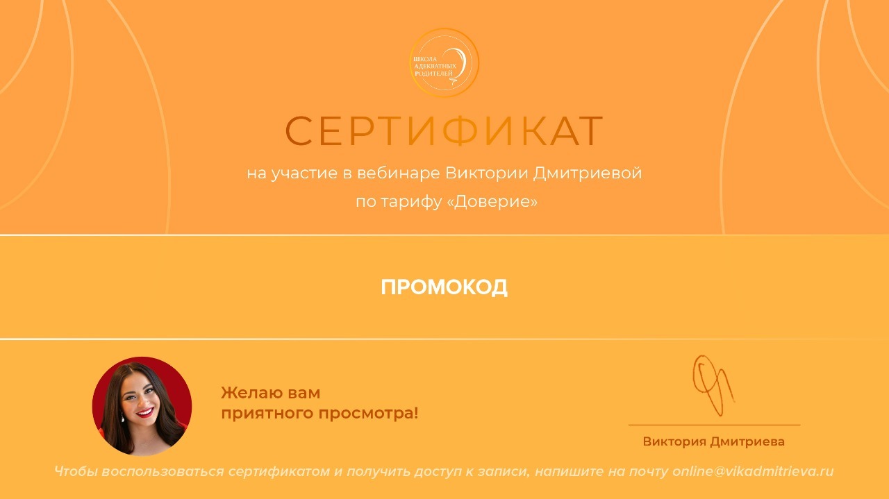 При покупке вебинара в подарок, на адрес электронной почты вам придет Подарочный сертификат с промокодом, который вы можете подарить любимому человеку.