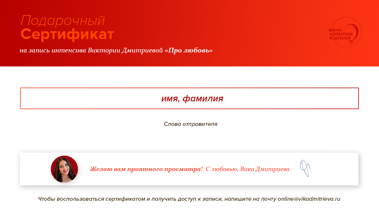 Как же это ценно - иметь возможность получать знания по таким важным дисциплинам, как семейные отношения. Благодарю, Виктория, за такой интересны и вдохновляющий интенсив "Про любовь". Кладезь полезной информации и практических упражнений. Эти 6 часов онлайн пролетели незаметно